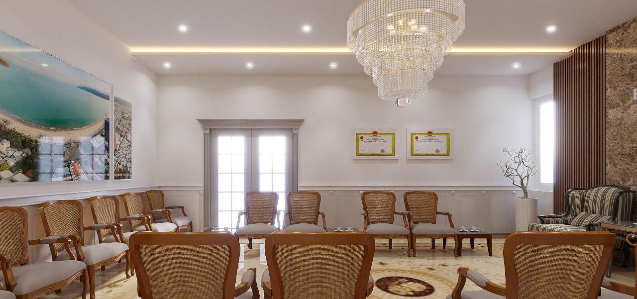 Phòng họp được cải tạo từ không gian của 2 phòng độc lập, với mong muốn tạo một điểm nhấn trong không gian chung của toà nhà. Chất liệu sử dụng phù hợp với vùng miền, gam màu vàng đậm nhạt đan xem tạo cảm giác ấm áp và gần gũi.
